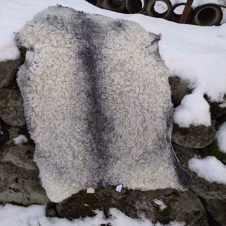 Ett stort och vackert tecknat fårskinn, det är ett ljust skinn med markerad mörk rand i mitten och kanterna. Skinnet är smidigt och har stora, mjuka lockar med hög glans. Prisnedsatt för att det har en pälssöm på 7 cm i nederkanten på vänstra sidan. Sömmen syns inte från framsidan, utan döljs helt av ullen, och den spelar ingen roll för hållbarheten.